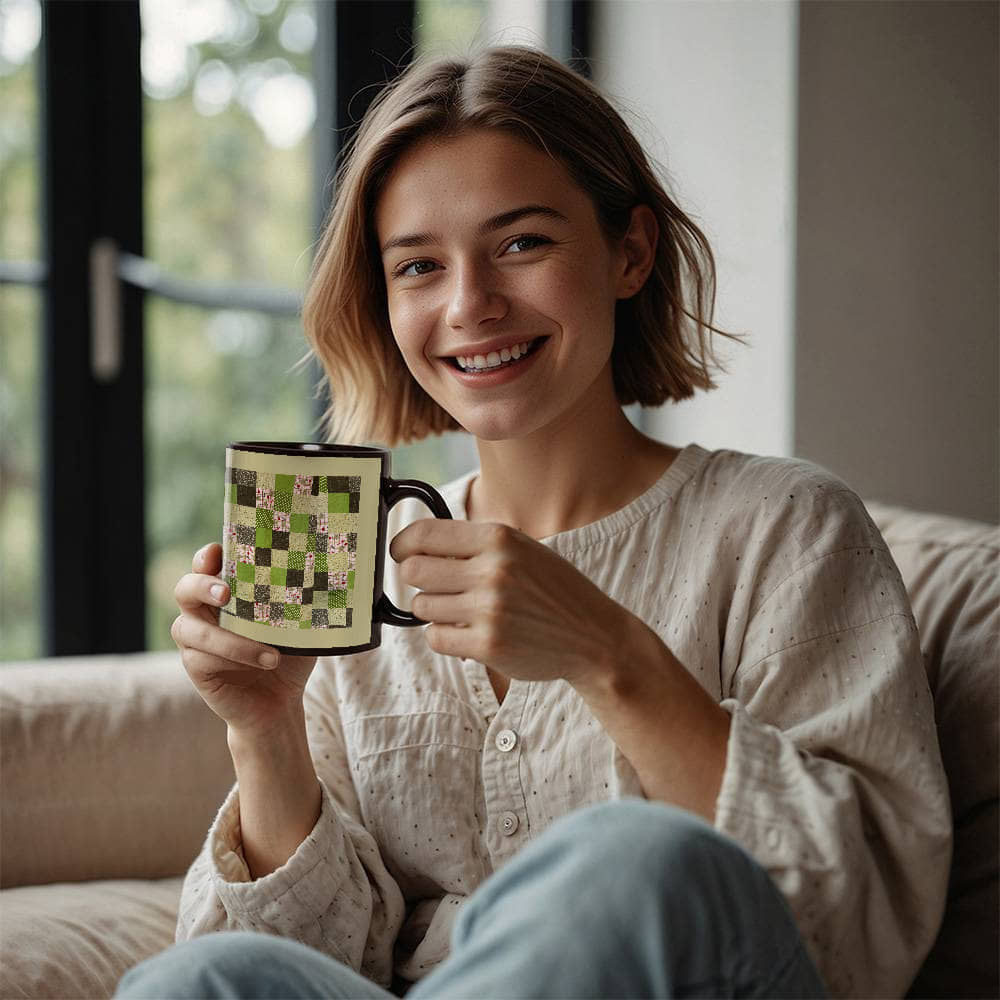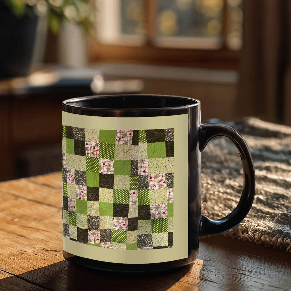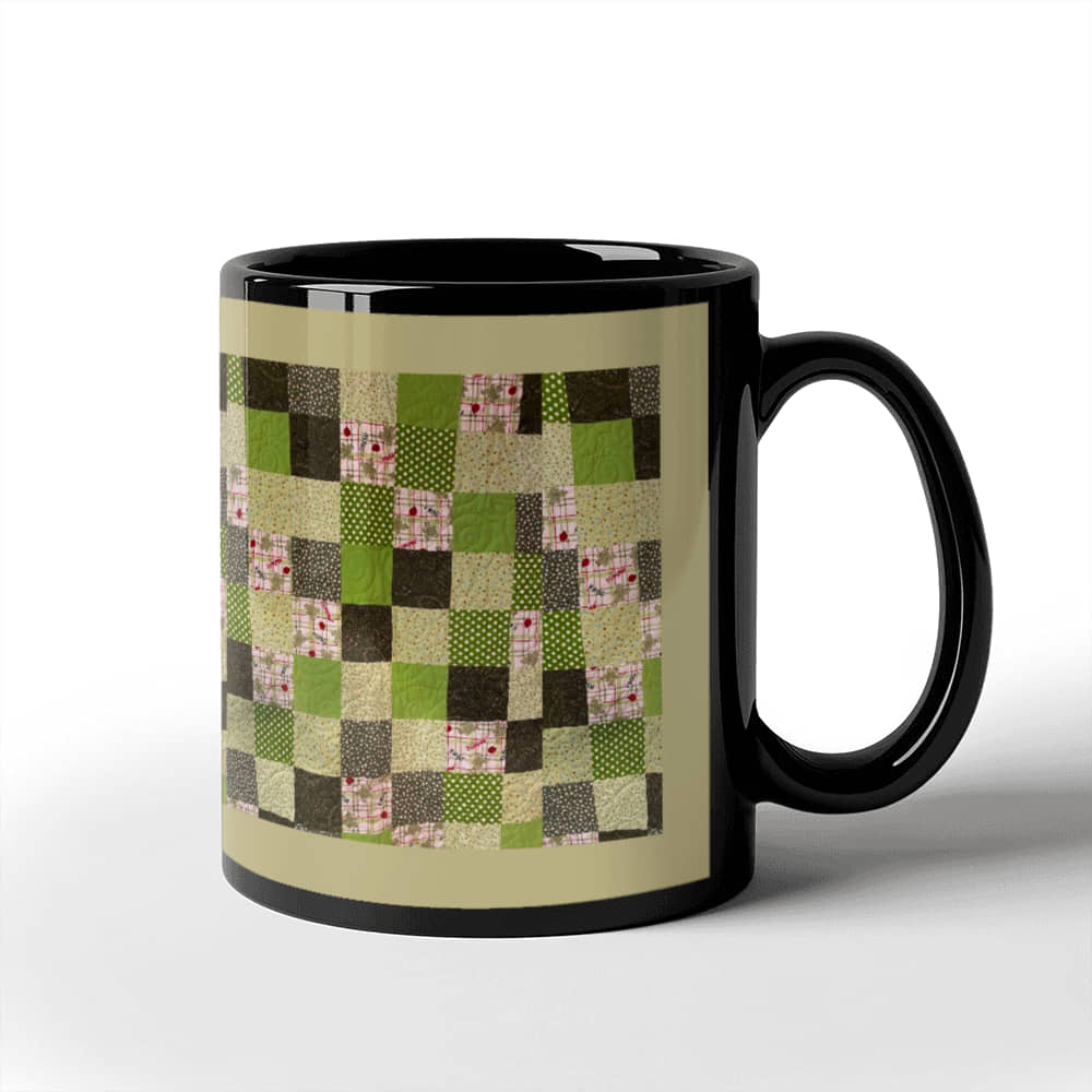 Green quilt for Black Ceramic Mug Tan border